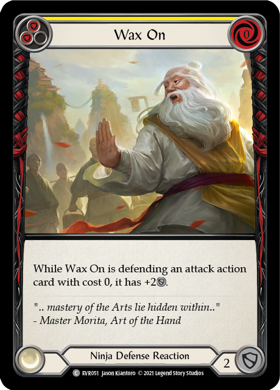 While Wax On is defending an attack action card with cost 0, it gains +2[Defense].